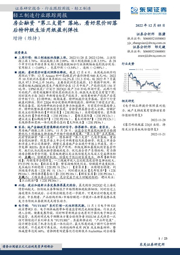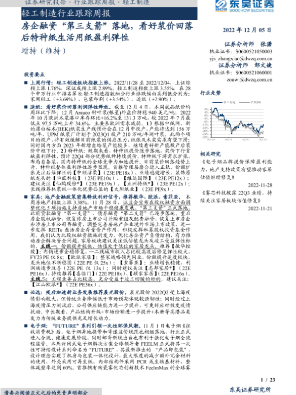 【东吴证券】【20221205】轻工制造行业跟踪周报:房企融资“第三支箭”落地,看好浆价回落后特种纸生活用纸盈利弹性-23页