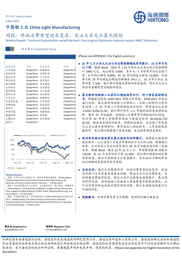 【海通国际】【20221206】中国轻工业周报:终端消费有望迎来复苏,关注文具龙头晨光股份-19页