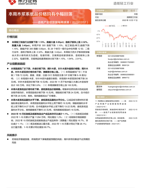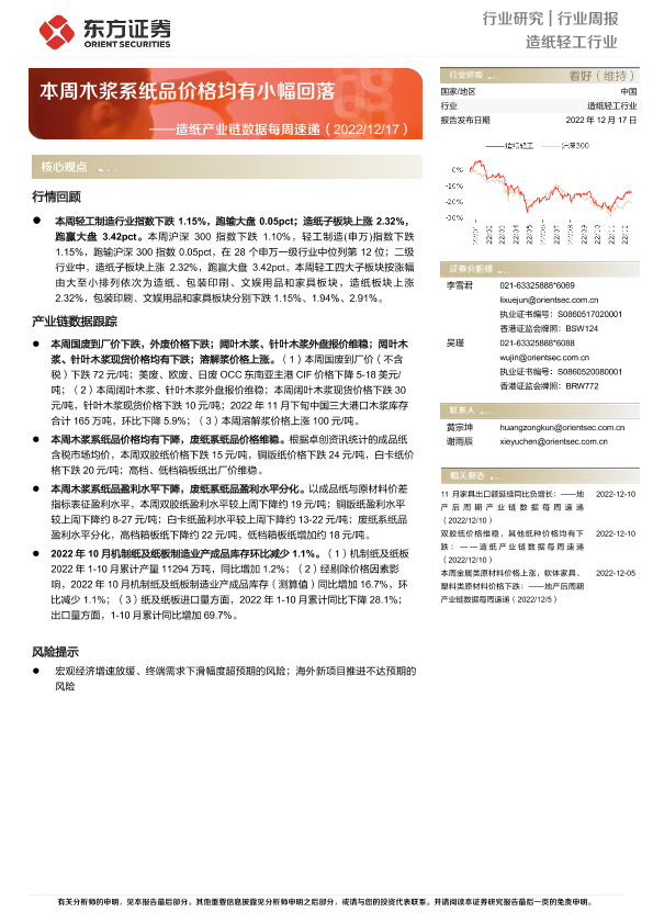 【东方证券】【20221217】20221217-东方证券-造纸产业链数据每周速递:本周木浆系纸品价格均有小幅回落-13页