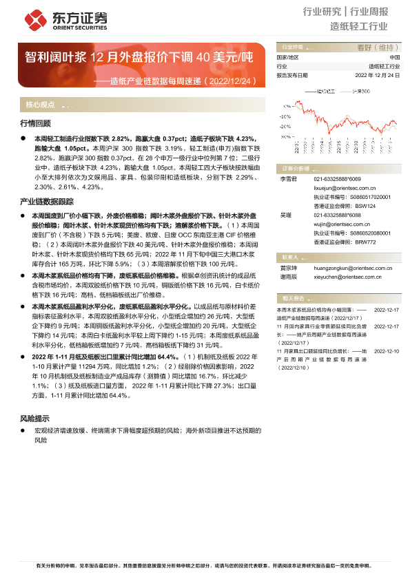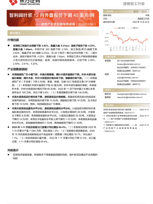 【东方证券】【20221224】20221224-东方证券-造纸产业链数据每周速递:智利阔叶浆12月外盘报价下调40美元 吨-13页