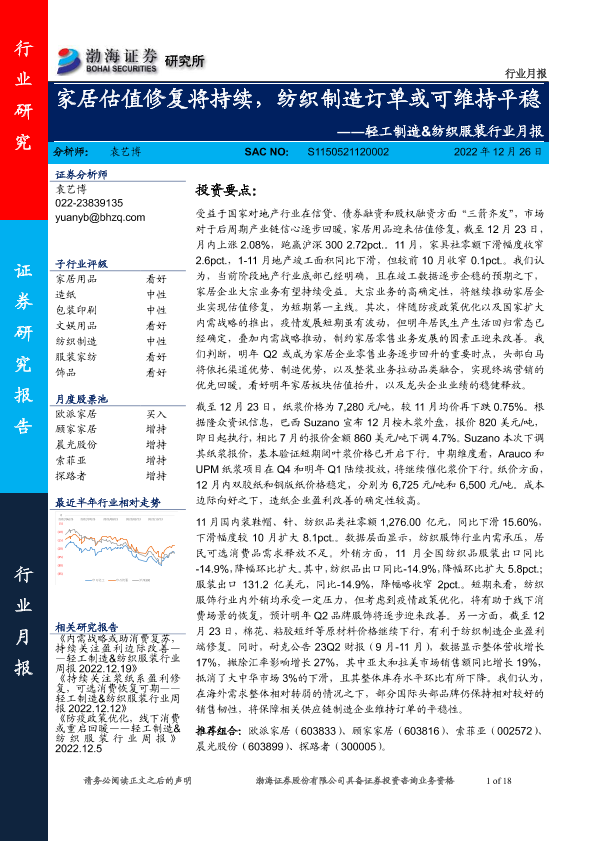 【渤海证券】【20221226】20221226-渤海证券-轻工制造&纺织服装行业月报:家居估值修复将持续,纺织制造订单或可维持平稳-18页
