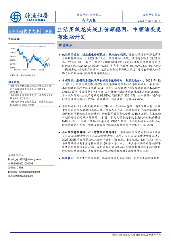 【海通证券】【20221225】20221225-海通证券-造纸轻工行业周报:生活用纸龙头线上份额稳固,中顺洁柔发布激励计划-11页