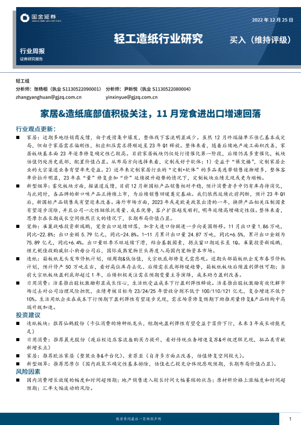 【国金证券】【20221225】轻工造纸行业研究:家居&造纸底部值积极关注,11月宠食进出口增速回落-19页