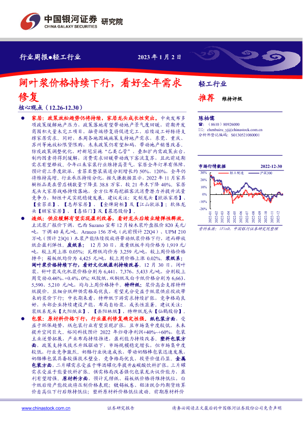 【银河证券】【20230102】20230102-中国银河-轻工行业周报:阔叶浆价格持续下行,看好全年需求修复-21页