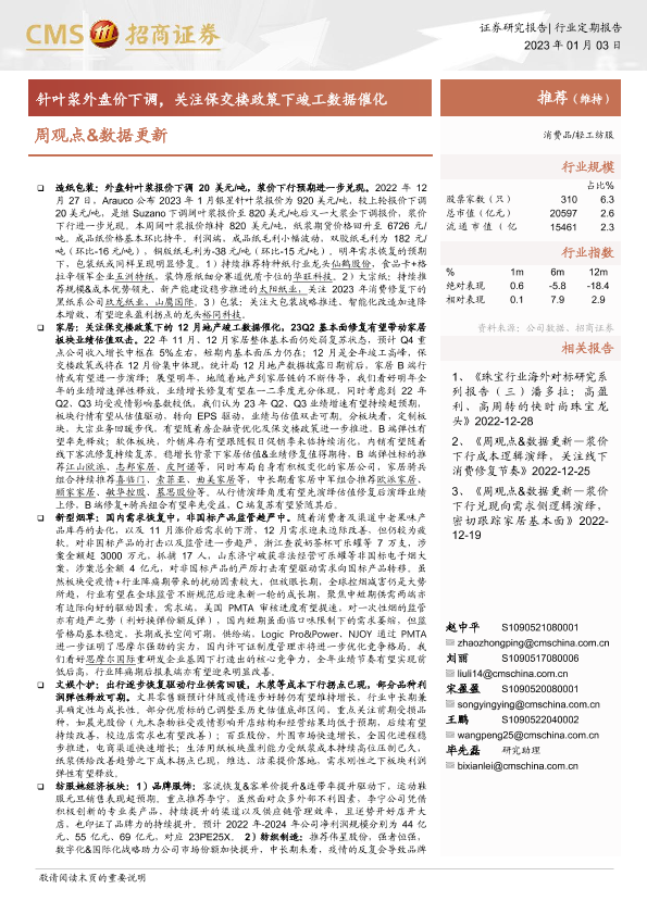 【海通证券】【20230103】轻工纺服周观点&数据更新:针叶浆外盘价下调,关注保交楼政策下竣工数据催化-21页