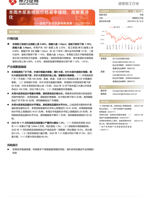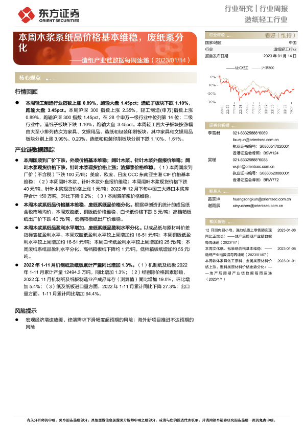 【东方证券】【20230114】20230114-东方证券-造纸产业链数据每周速递:本周木浆系纸品价格基本维稳,废纸系分化-13页