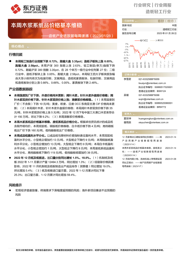【东方证券】【20230128】20230128-东方证券-造纸产业链数据每周速递:本周木浆系纸品价格基本维稳-13页