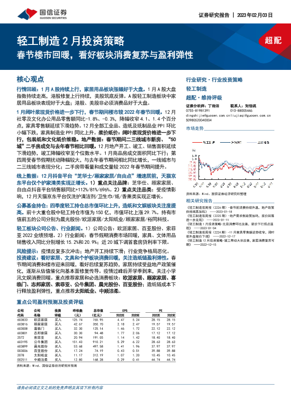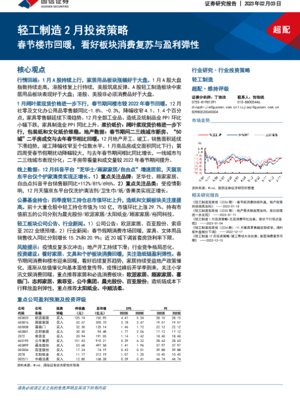 【国信证券】【20230203】20230203-国信证券-轻工制造2月投资策略:春节楼市回暖,看好板块消费复苏与盈利弹性-26页