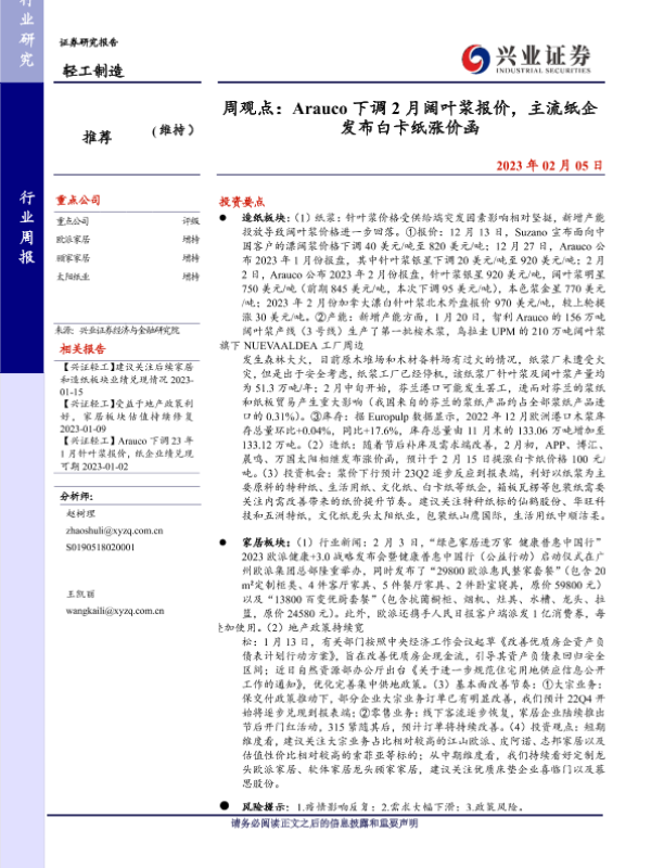 【兴业证券】【20230205】20230205-兴业证券-轻工制造周观点:Arauco下调2月阔叶浆报价,主流纸企发布白卡纸涨价函-21页