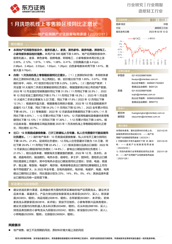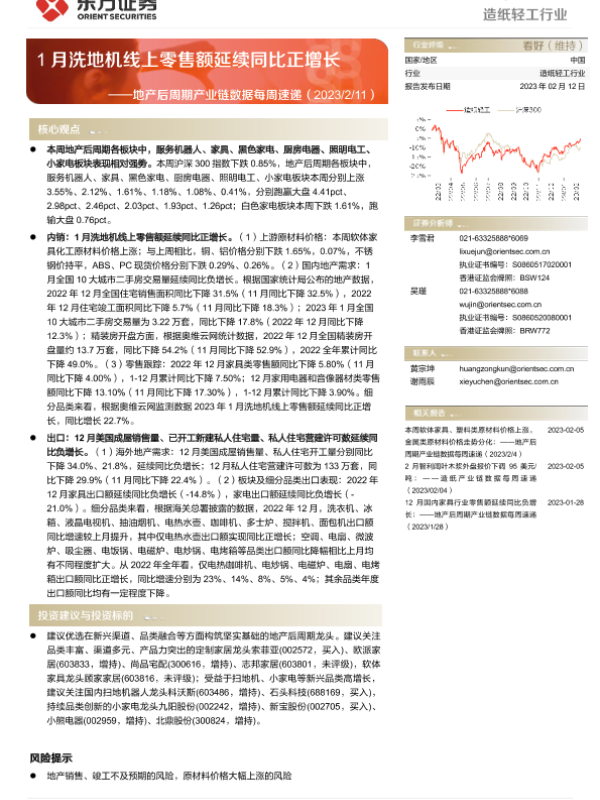 【东方证券】【20230212】20230212-东方证券-造纸轻工行业行业周报:地产后周期产业链数据每周速递-1月洗地机线上零售额延续同比正增长-13页