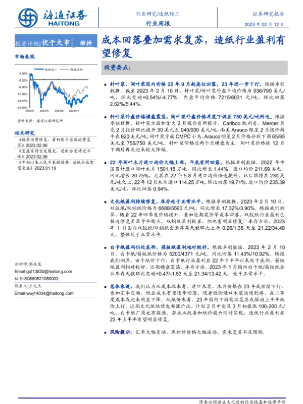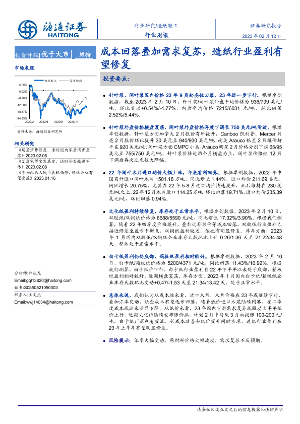 【海通证券】【20230212】20230212-海通证券-造纸轻工行业周报:成本回落叠加需求复苏,造纸行业盈利有望修复-13页