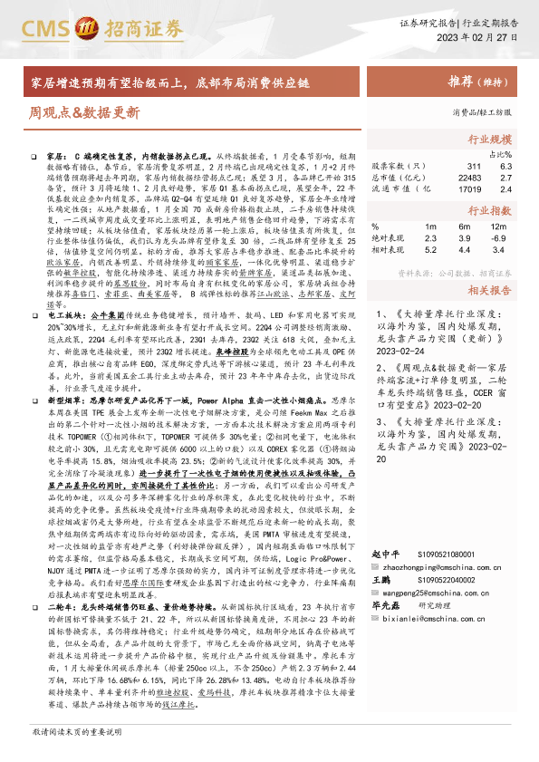 【海通证券】【20230227】轻工纺服周观点&数据更新:家居增速预期有望拾级而上,底部布局消费供应链-22页