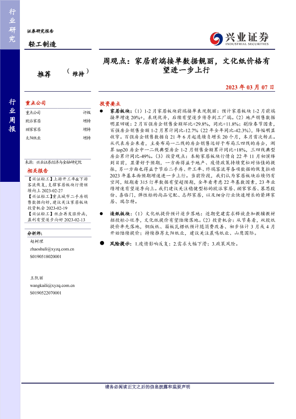【兴业证券】【20230307】20230307-兴业证券-轻工制造周观点:家居前端接单数据靓丽,文化纸价格有望进一步上行-21页