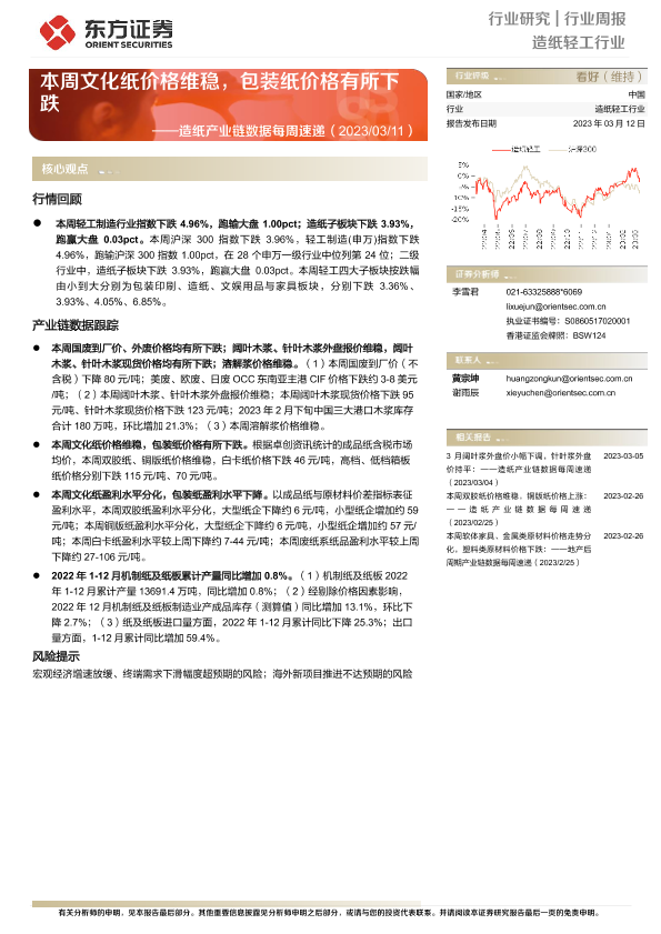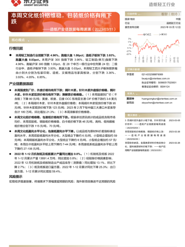 【东方证券】【20230312】20230312-东方证券-造纸产业链数据每周速递:本周文化纸价格维稳,包装纸价格有所下跌-13页
