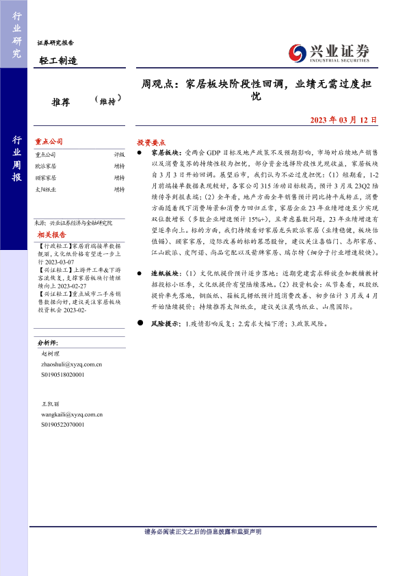 【兴业证券】【20230312】20230312-兴业证券-轻工制造周观点:家居板块阶段性回调,业绩无需过度担忧-21页