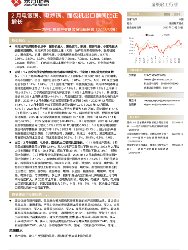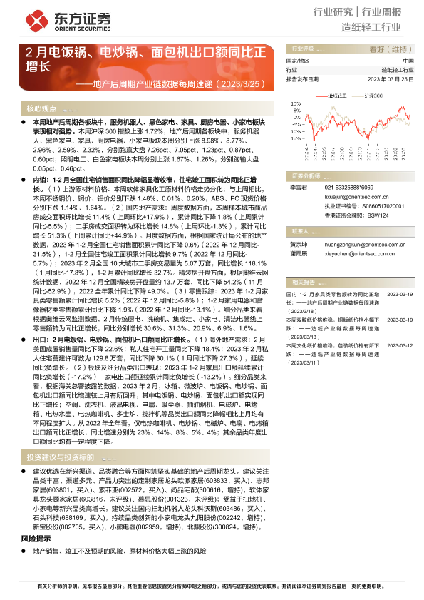 【东方证券】【20230325】20230325-东方证券-造纸轻工行业行业周报:地产后周期产业链数据每周速递-2月电饭锅、电炒锅、面包机出口额同比正增长-16页