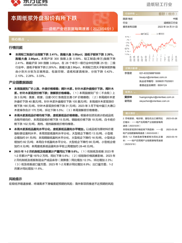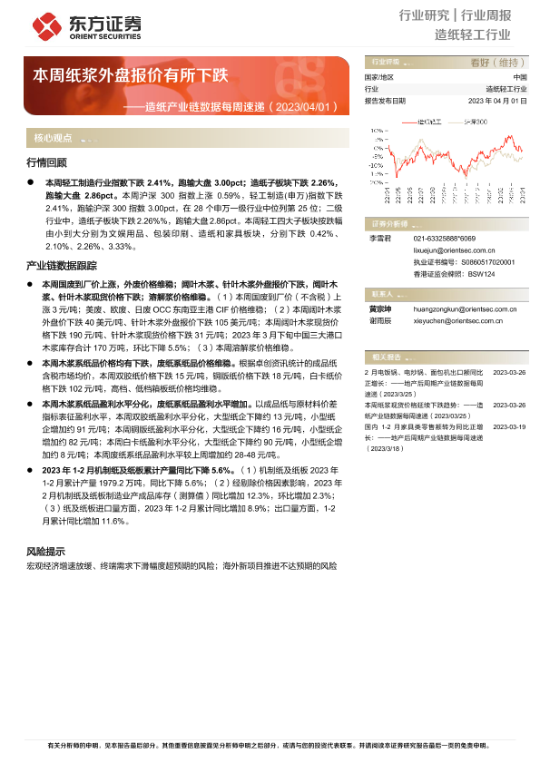 【东方证券】【20230401】20230401-东方证券-造纸产业链数据每周速递:本周纸浆外盘报价有所下跌-12页