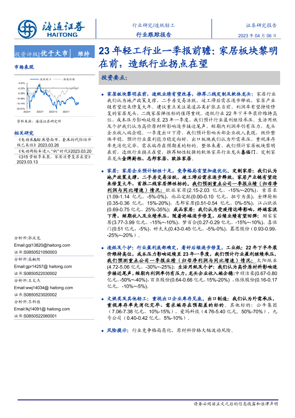 【海通证券】【20230406】23年轻工行业一季报前瞻:家居板块黎明在前,造纸行业拐点在望-10页