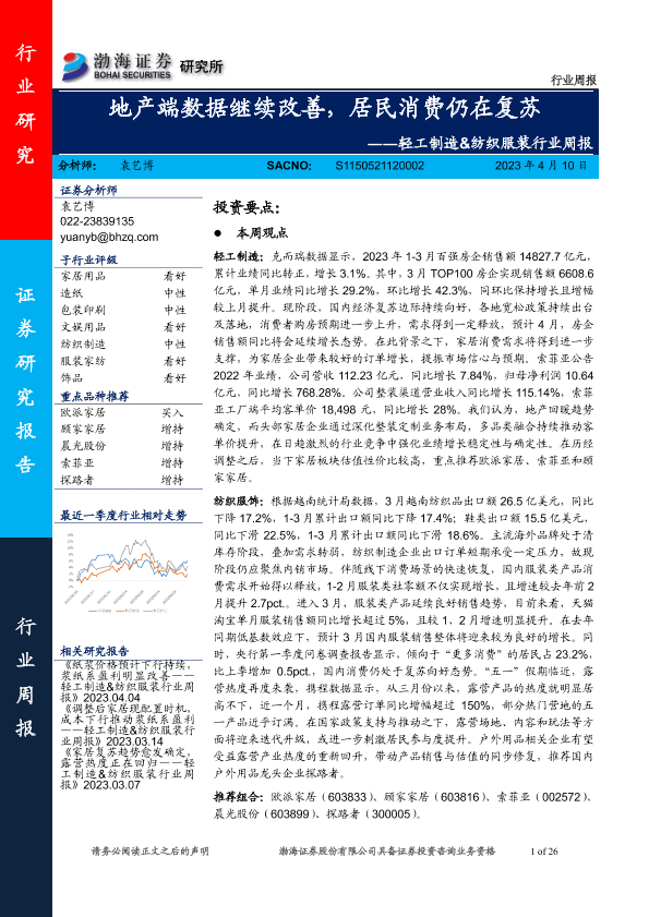 【渤海证券】【20230410】20230410-渤海证券-轻工制造&纺织服装行业周报:地产端数据继续改善,居民消费仍在复苏-26页