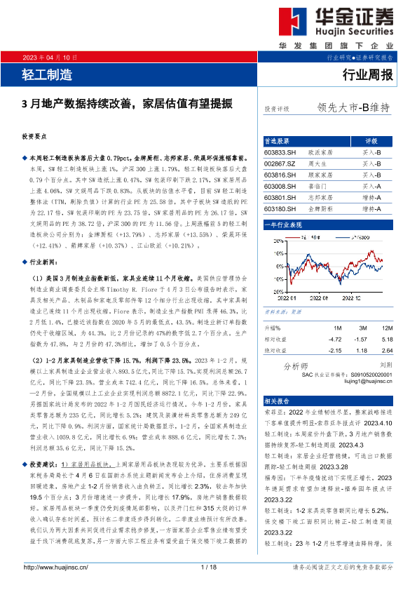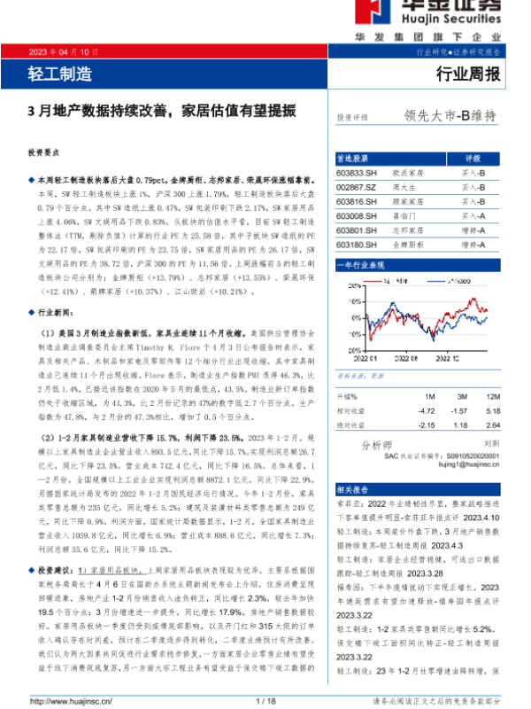 【华金证券】【20230410】20230410-华金证券-轻工制造行业周报:3月地产数据持续改善,家居估值有望提振-18页
