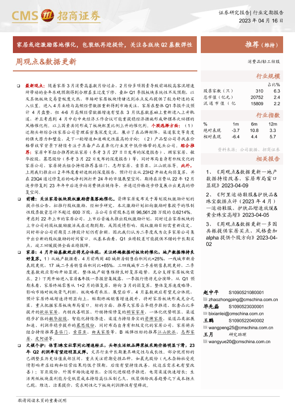 【海通证券】【20230416】轻工纺服周观点&数据更新:家居或迎激励落地催化,包装纸再迎提价,关注各版块Q2基数弹性-27页