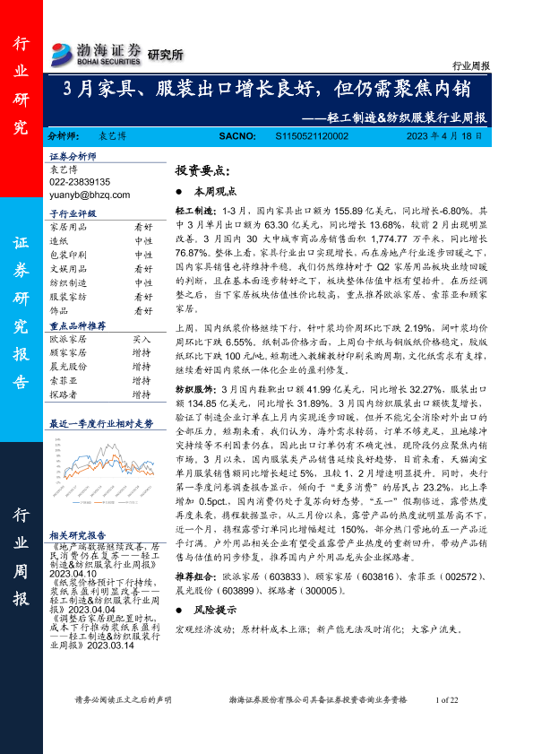 【渤海证券】【20230418】20230418-渤海证券-轻工制造&纺织服装行业周报:3月家具、服装出口增长良好,但仍需聚焦内销-22页