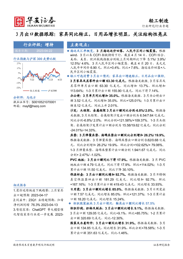 【华安证券】【20230422】20230422-华安证券-轻工制造行业专题:3月出口数据跟踪:家具同比转正,日用品增长明显,关注结构性亮点-16页