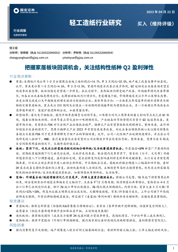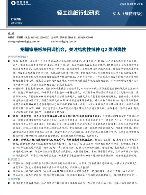 【国金证券】【20230422】20230422-国金证券-轻工造纸行业研究:把握家居板块回调机会,关注结构性纸种Q2盈利弹性-18页