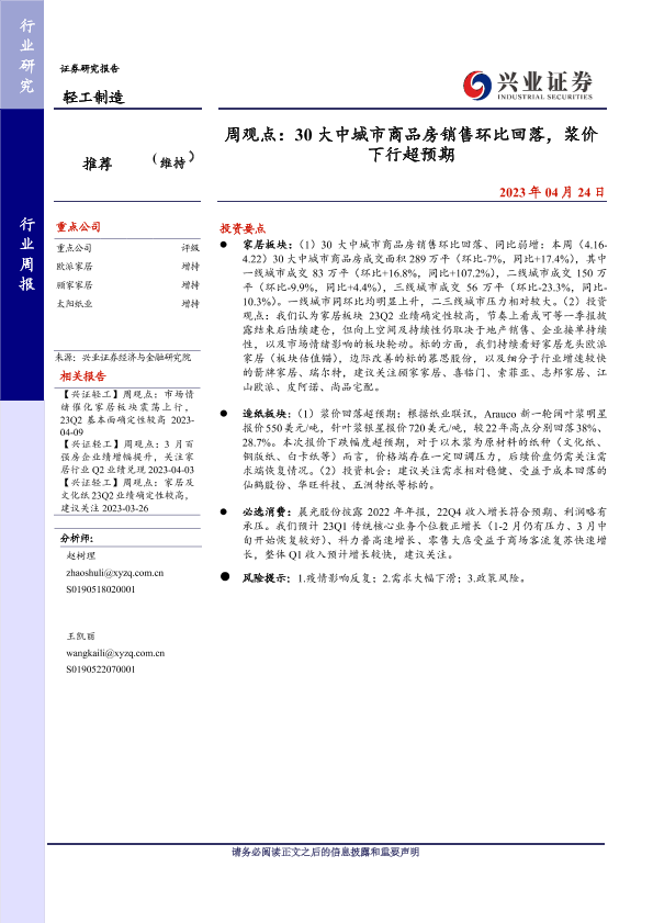 【兴业证券】【20230424】20230424-兴业证券-轻工制造行业周报:周观点:30大中城市商品房销售环比回落,浆价下行超预期-21页