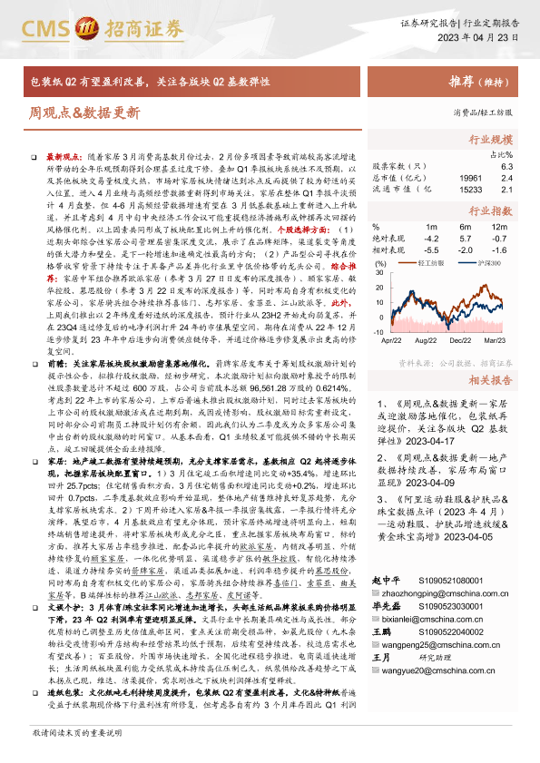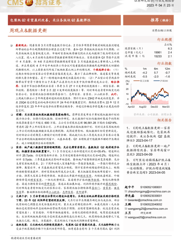 【海通证券】【20230423】20230423-招商证券-轻工纺服行业定期报告:周观点&数据更新-包装纸Q2有望盈利改善,关注各版块Q2基数弹性-26页
