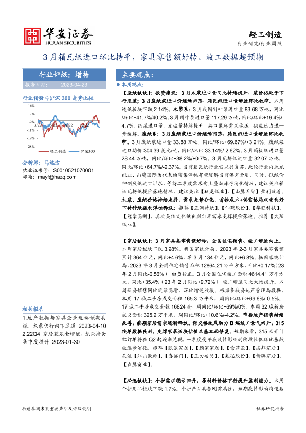 【华安证券】【20230423】20230424-华安证券-轻工制造行业周报:3月箱瓦纸进口环比持平,家具零售额好转、竣工数据超预期-31页