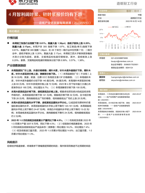 【东方证券】【20230514】20230514-东方证券-造纸产业链数据每周速递:4月智利阔叶浆、针叶浆报价均有下跌-13页