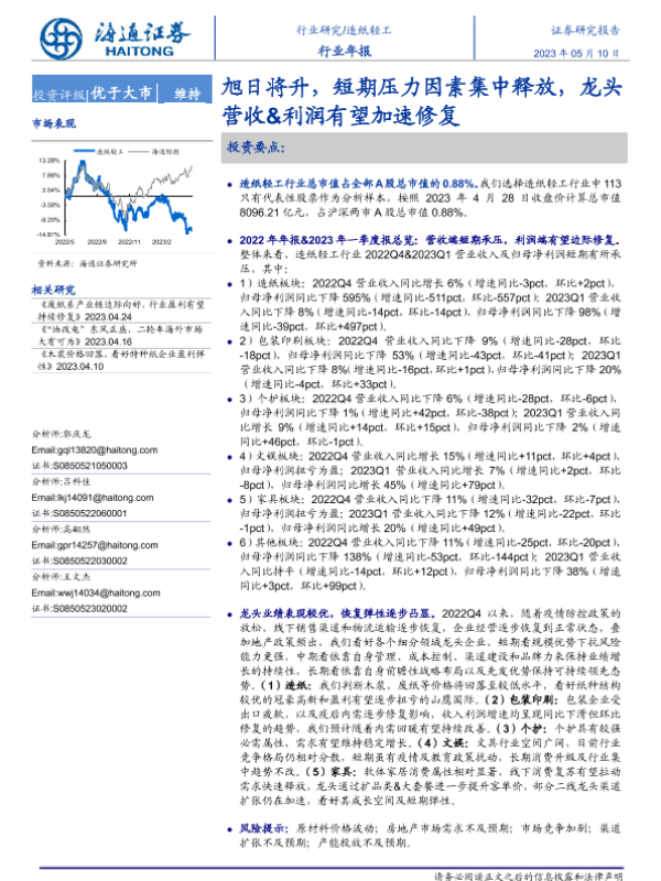 【海通证券】【20230510】20230510-海通证券-造纸轻工行业年报:旭日将升,短期压力因素集中释放,龙头营收&利润有望加速修复-10页