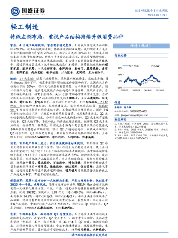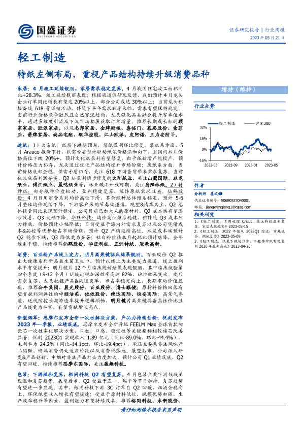 【国盛证券】【20230521】20230521-国盛证券-轻工制造行业周报:特纸左侧布局,重视产品结构持续升级消费品种-38页