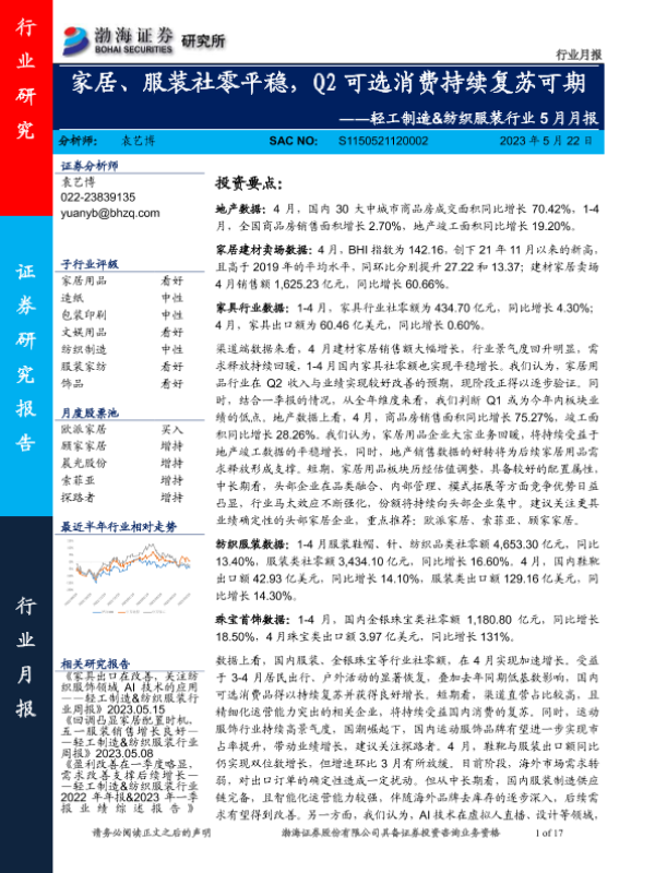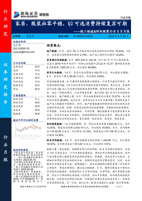 【渤海证券】【20230522】轻工制造&纺织服装行业5月月报:家居、服装社零平稳,Q2可选消费持续复苏可期-17页