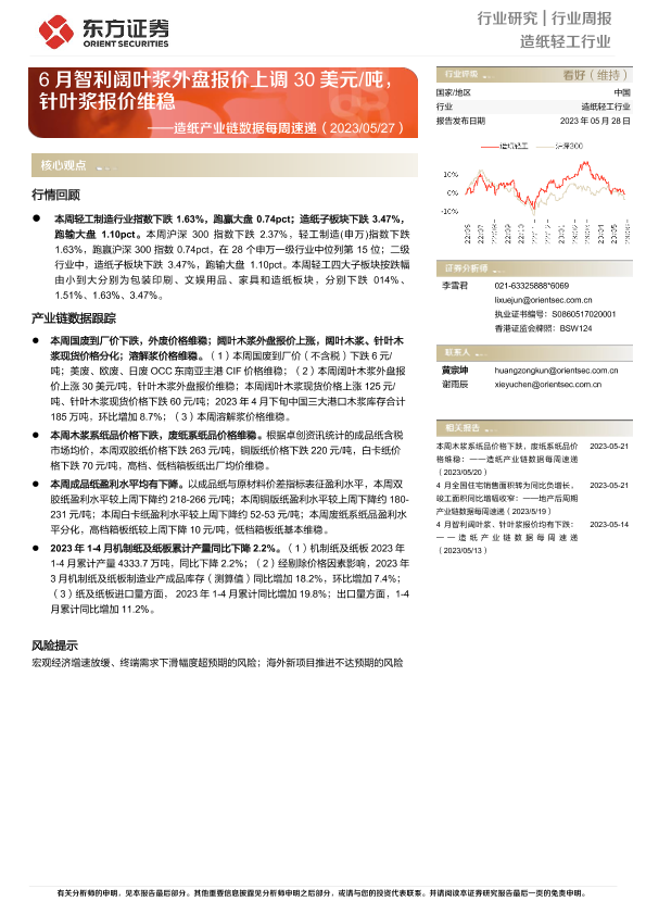 【东方证券】【20230528】20230528-东方证券-造纸轻工行业:造纸产业链数据每周速递-6月智利阔叶浆外盘报价上调30美元 吨,针叶浆报价维稳-13页
