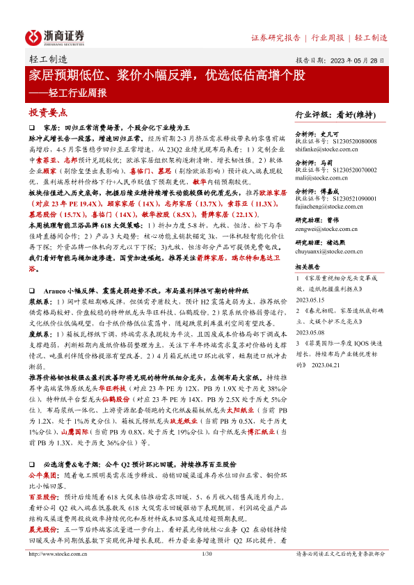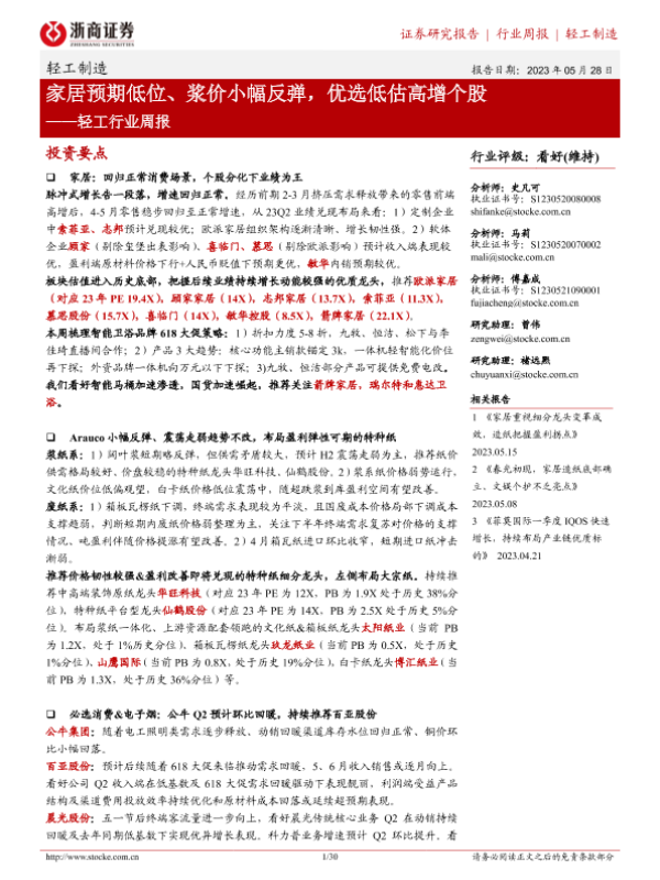 【浙商证券】【20230528】20230528-浙商证券-轻工行业周报:家居预期低位、浆价小幅反弹,优选低估高增个股-30页