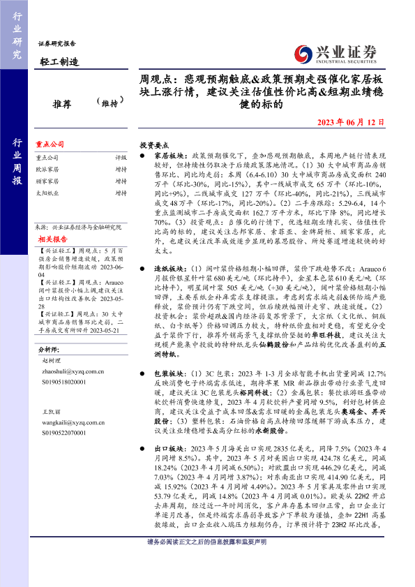 【兴业证券】【20230612】20230612-兴业证券-轻工制造周观点:悲观预期触底&政策预期走强催化家居板块上涨行情,建议关注估值性价比高&短期业绩稳健的标的-23页