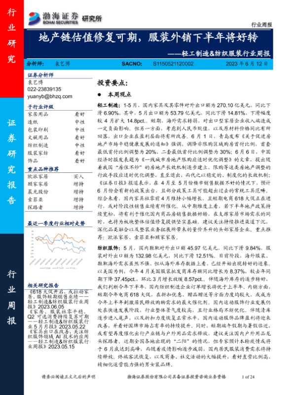 【渤海证券】【20230612】20230612-渤海证券-轻工制造&纺织服装行业周报:地产链估值修复可期,服装外销下半年将好转-24页