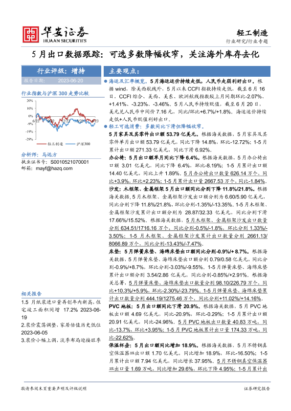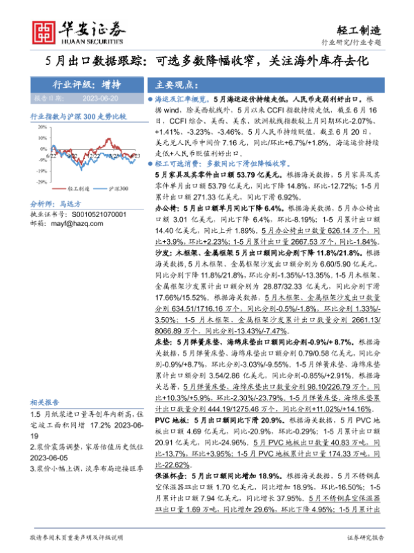 【华安证券】【20230620】20230620-华安证券-轻工制造行业专题:5月出口数据跟踪:可选多数降幅收窄,关注海外库存去化-24页
