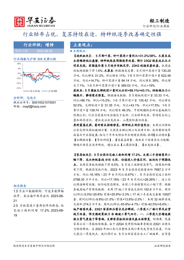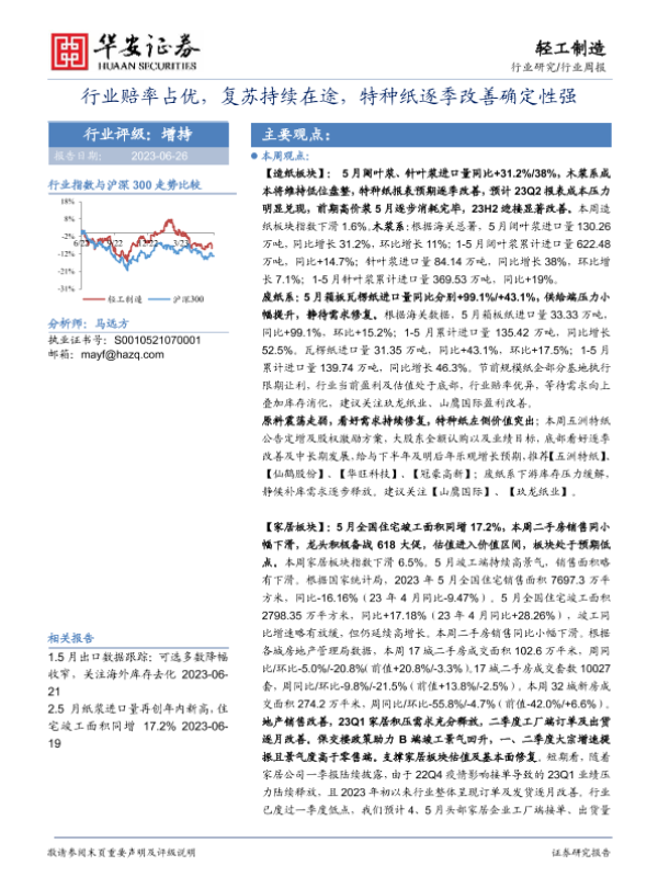 【华安证券】【20230626】20230625-华安证券-轻工制造行业周报:行业赔率占优,复苏持续在途,特种纸逐季改善确定性强-28页