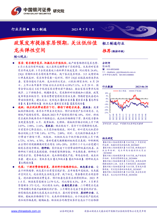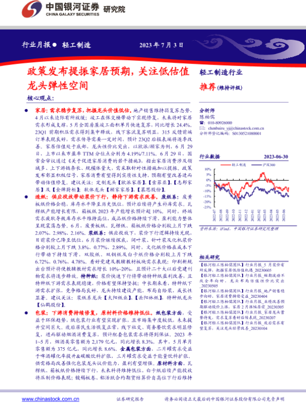 【银河证券】【20230703】20230703-中国银河-轻工制造行业行业月报:政策发布提振家居预期,关注低估值龙头弹性空间-22页