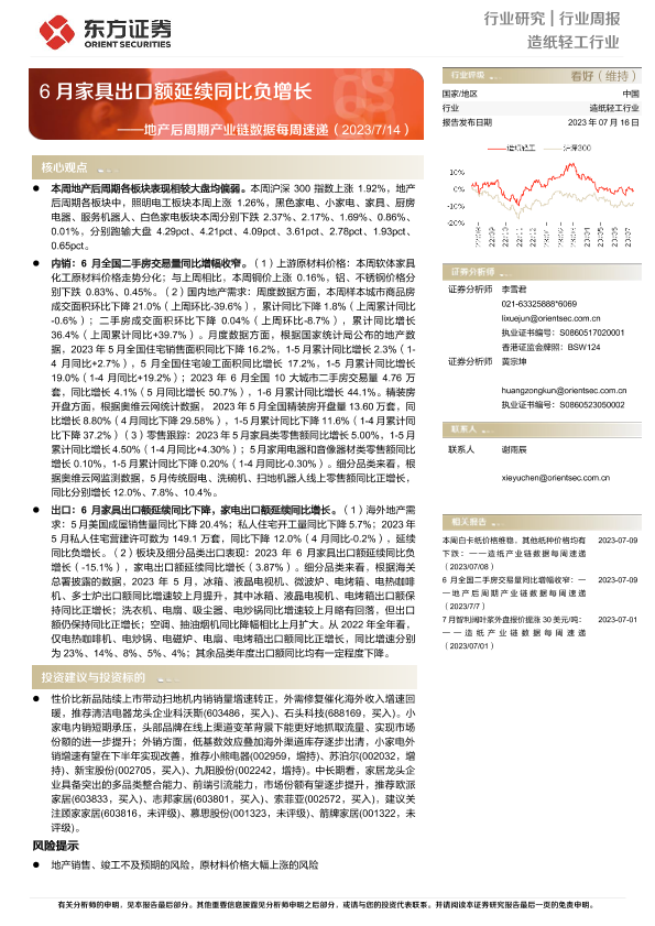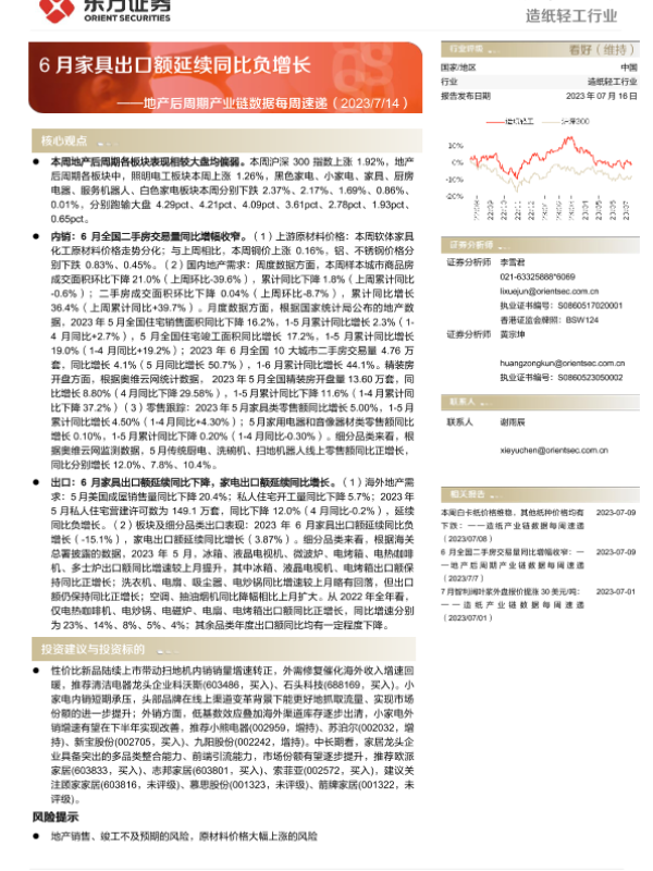 【东方证券】【20230716】20230716-东方证券-造纸轻工行业行业周报:地产后周期产业链数据每周速递-6月家具出口额延续同比负增长-15页