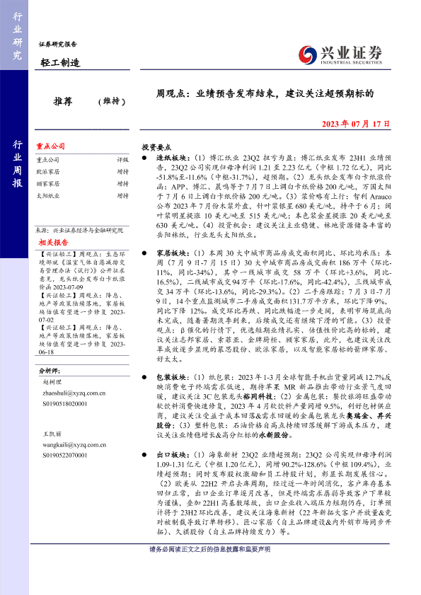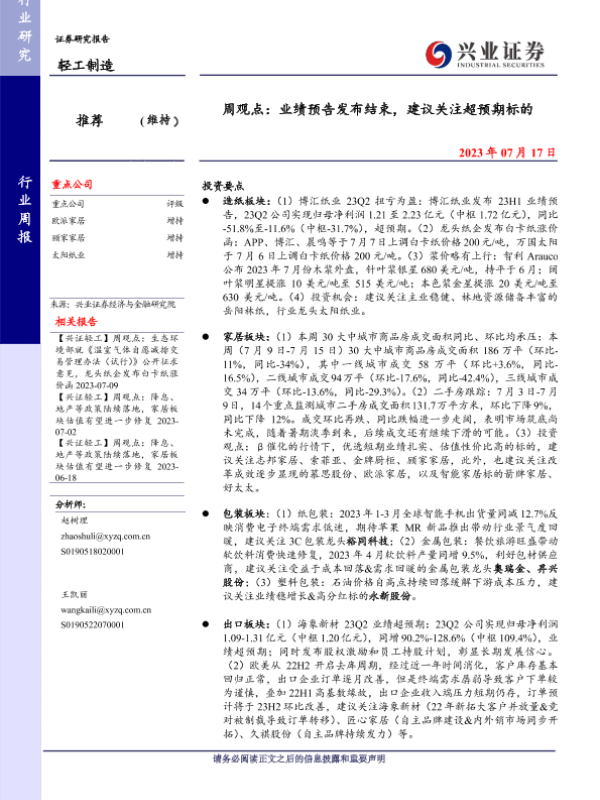 【兴业证券】【20230717】20230717-兴业证券-轻工制造周观点:业绩预告发布结束,建议关注超预期标的-23页