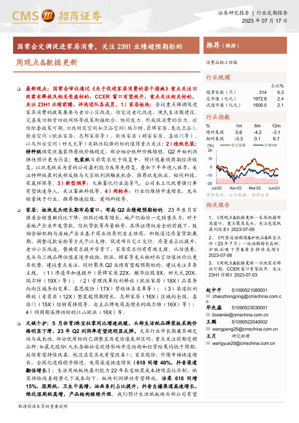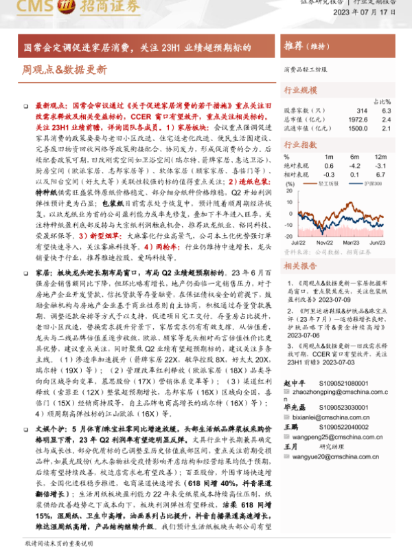 【海通证券】【20230717】20230717-招商证券-消费品轻工纺服周观点&数据更新:国常会定调促进家居消费,关注23H1业绩超预期标的-26页