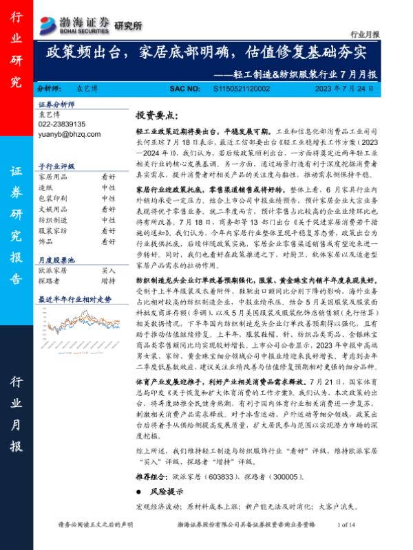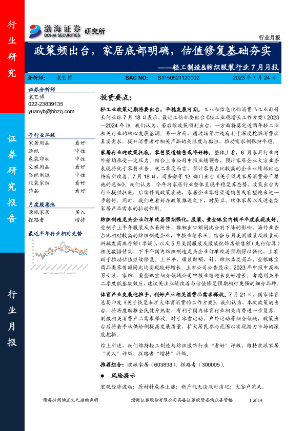 【渤海证券】【20230724】轻工制造&纺织服装行业7月月报:政策频出台,家居底部明确,估值修复基础夯实-14页