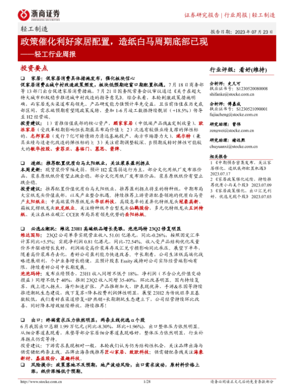 【浙商证券】【20230723】20230723-浙商证券-轻工行业周报:政策催化利好家居配置,造纸白马周期底部已现-28页