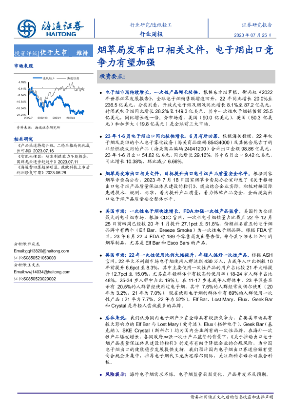 【海通证券】【20230725】20230725-海通证券-造纸轻工行业周报:烟草局发布出口相关文件,电子烟出口竞争力有望加强-12页