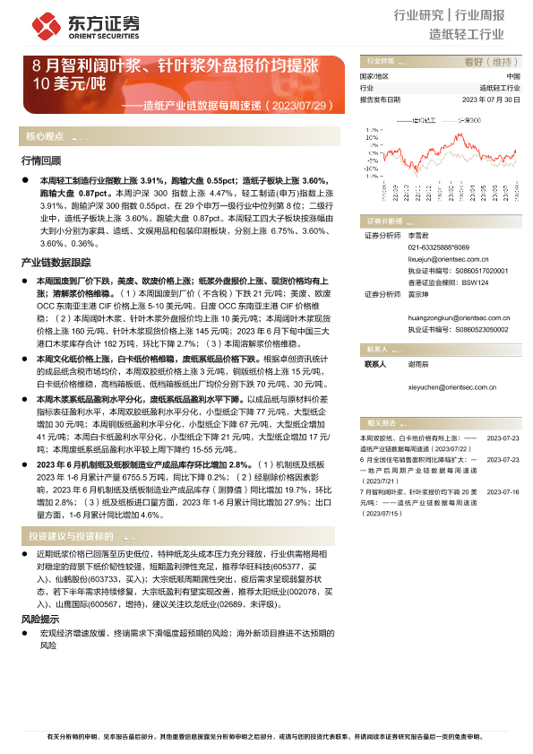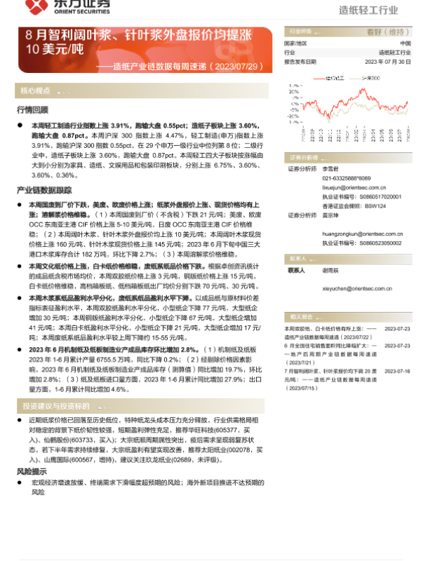 【东方证券】【20230730】20230730-东方证券-造纸产业链数据每周速递:8月智利阔叶浆、针叶浆外盘报价均提涨10美元 吨-14页