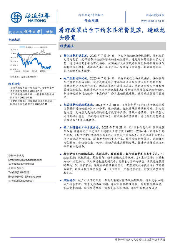 【海通证券】【20230731】20230731-海通证券-造纸轻工行业周报:看好政策出台下的家具消费复苏,造纸龙头修复-13页